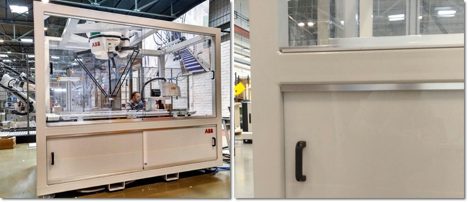 ABB necesitaba para su robot célula picking de un mueble para demostraciones, un recubrimiento exterior de su carcasa por temas de seguridad. Es un robot que trabaja a gran velocidad manipulando 180 piezas de 4×4 centímetros que viajan sobre una cinta transportadora. Estas pequeñas piezas se lacaron en diferentes colores: rojo, azul y negro, para que el ‘ojo’ del robot las pudiera detectar. La exposición al público sin protección representaba un riesgo. Un trabajo fino realizado por el equipo de Ricard Mata Group.